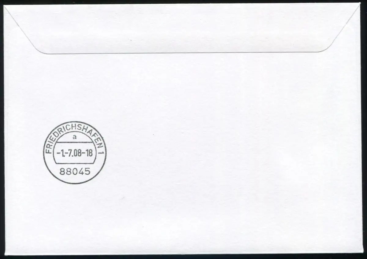 Luftschiffspostbeleg der Deutschen Post AG mit Bordstemepl ZEPPELIN NT anläßlich 100 Jahre 12-Stunden-Fahrt des LZ 4 über der Schweiz, mit Bordsiegel Marke Zeppelin NT 2008, Ankunftsstempel FRIEDRICHSHAFEN 1.7.08