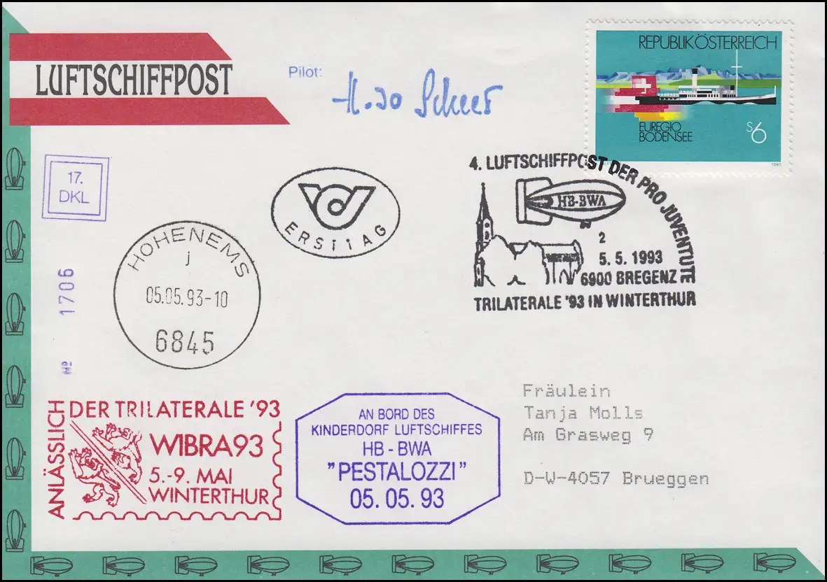 Luftschiffspost DKL 17 PESTALOZZI WIBRA93 Winterthur FDC ESSt Bregenz 5.5.1993
