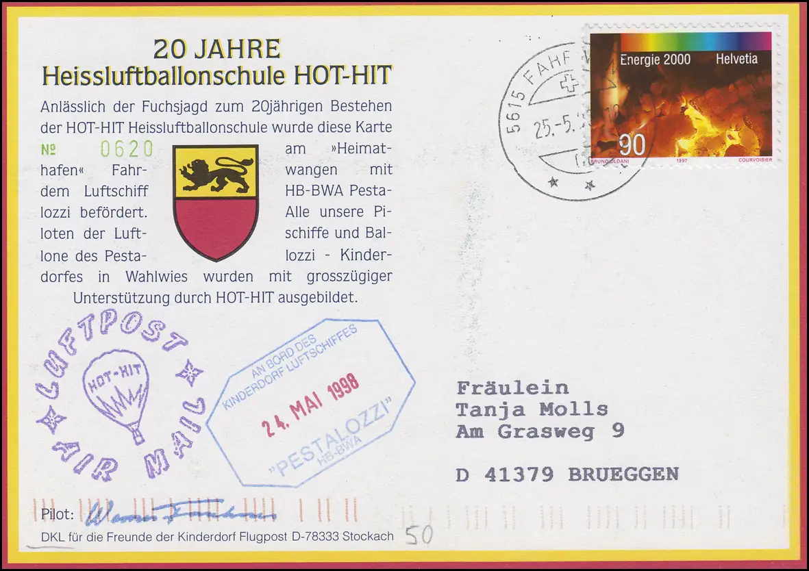 Luftschiffspost DKL 50 PESTALOZZI Heissluftballonschule FAHRWANGEN 25.5.1998