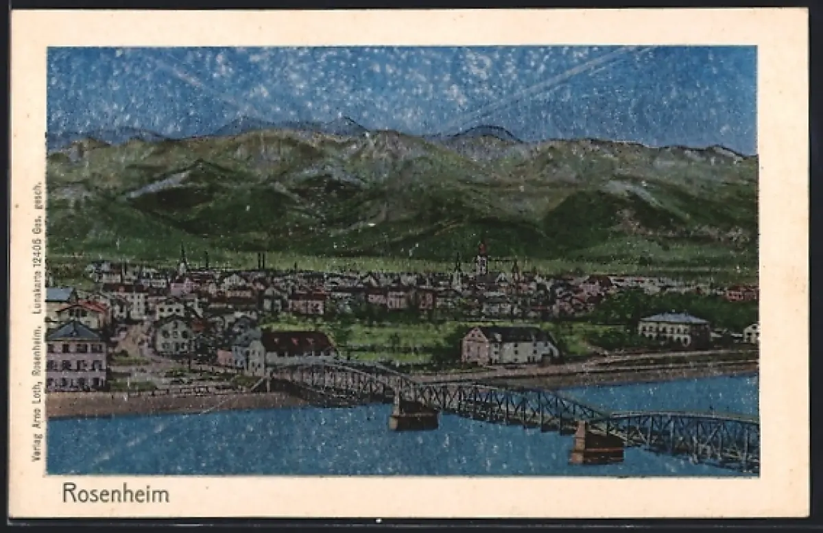 Luna-AK Rosenheim / Bayern, Teilansicht mit Brücke