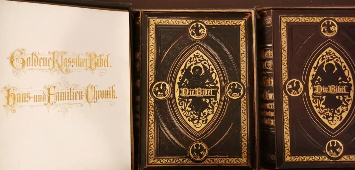 Die Heilige Schrift des Alten und Neuen Testaments. Außentitel: Die Bibel. Mit 31 chromographierten und 61 Tondruck-Vollbildern nach klassischen Gemälden alter und neuer Meister der deutschen, italienischen, holländischen und französischen Schule und Entwürfen der Wandsbeker Kunstanstalt. Goldene Klassiker Bibel Haus- und Familien-Chronik nach Konkurrenz-Entwürfen deutscher Ornamentiker und Kalligraphen. Brauner Ledereinband mit aufwendiger Reliefprägung auf Vorder- und Rückdeckel. Auf dem Vorderdeckel und Buchrücken reichhaltige Goldverzierungen. Beiliegende Haus- und Familienchronik ohne Einträge. Einbände leicht bestoßen. Im Gelenk leicht beweglich. Papier teilweise minimal gebräunt und leicht gewellt. Sonst guter Gesamtzustand. Mit Lesebändchen