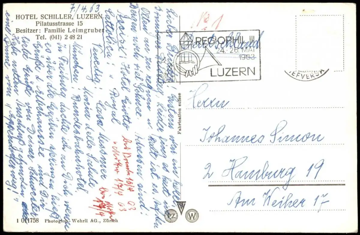 Luzern Lucerna HOTEL SCHILLER Bar Grill Room (Straßen-Ansicht) 1963