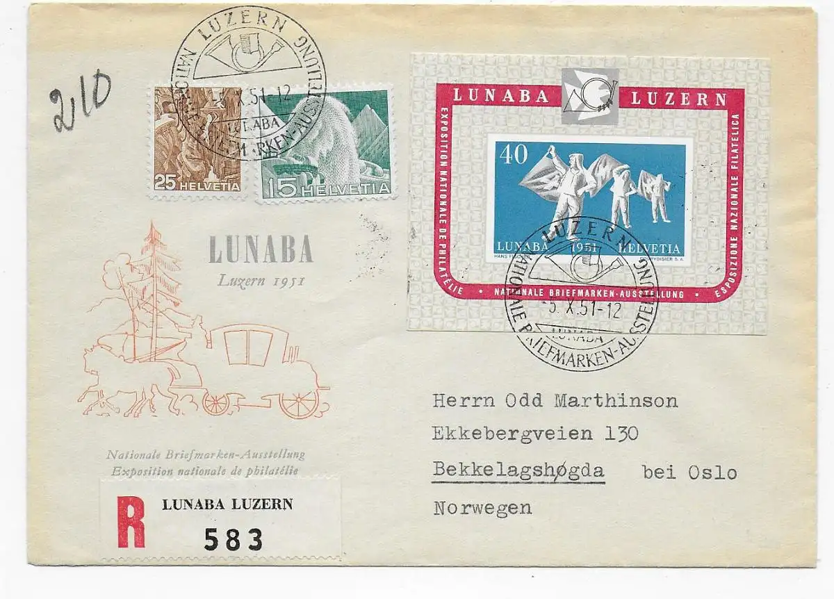 Luzern Nationale Briefmarkenausstellung 1951, FDC als Einschreiben nach Norwegen