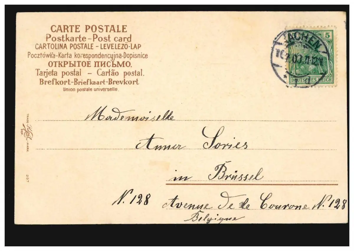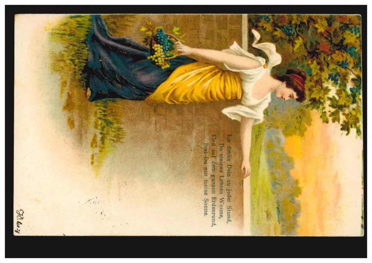 Lyrik-AK Frau mit Weintrauben-Korb, Gedicht Sehnsucht, AACHEN 1903 nach Brüssel