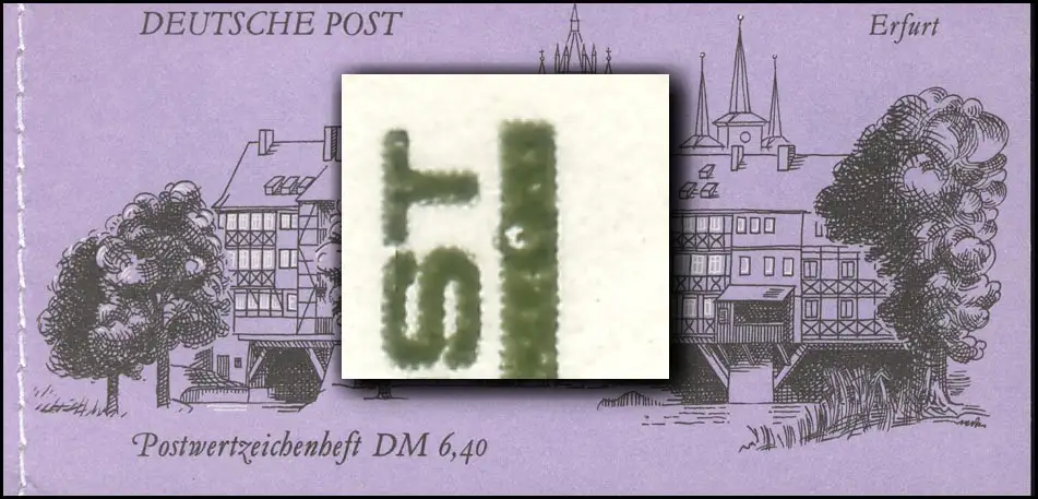 UV-Licht: vorder- und rückseitig weiße Nähfäden, Plattenfehler auf dem 30-Pfennig-Wert: weißer Fleck im Seitenbalken unter ST von von POST, Feld 1