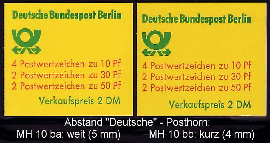 Markenheftchen-Set 10ba und 10bb: je ein MH mit weitem und mit kurzem Abstand zwischen Deutsche und dem Posthorn laut MICHEL