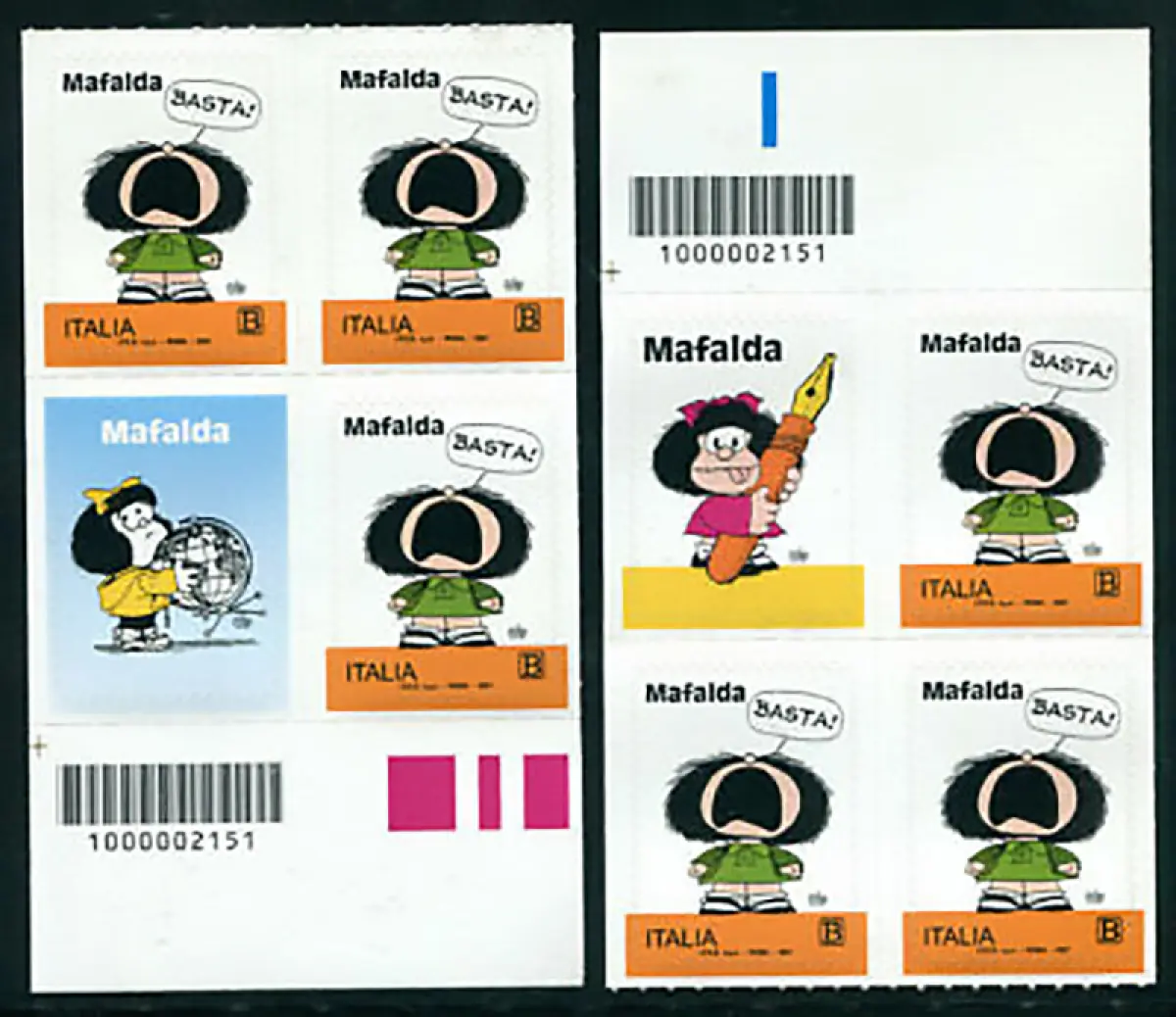 Mafalda linke Viertelblöcke mit Erinnofili und Barcode Ausgabe Mafalda 2021 in Blöcken mit den dazugehörigen Erinnofili Briefschließer und Barcode von der linken Seite des Blattes - Auflage der offiziellen Erinnofili nur 14.634 je Typ - Interessant