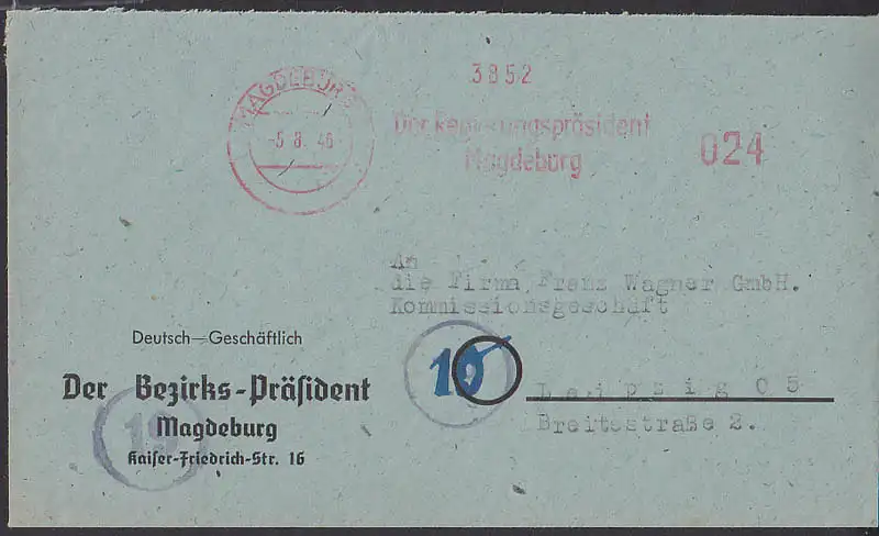 Magdeburg Dienstbrief Bezirks-Pr?sident, aptiert AFS 5.8.46, Fernbrief nach Leipzig