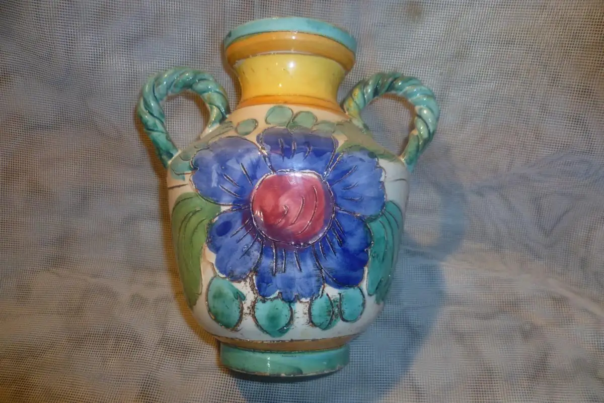 Majolika-Sgraffito-Vase mit geflochtenem Henkeln aus den Fünfzigern sommerliche Farbe in Ihr Leben (auch ohne Blumen!).