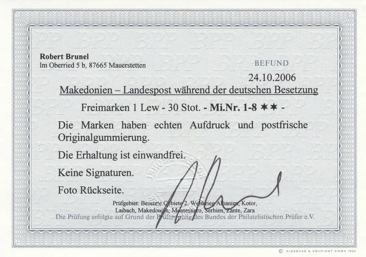 Makedonien: MiNr. 1-8, postfrisch, BPP Befund