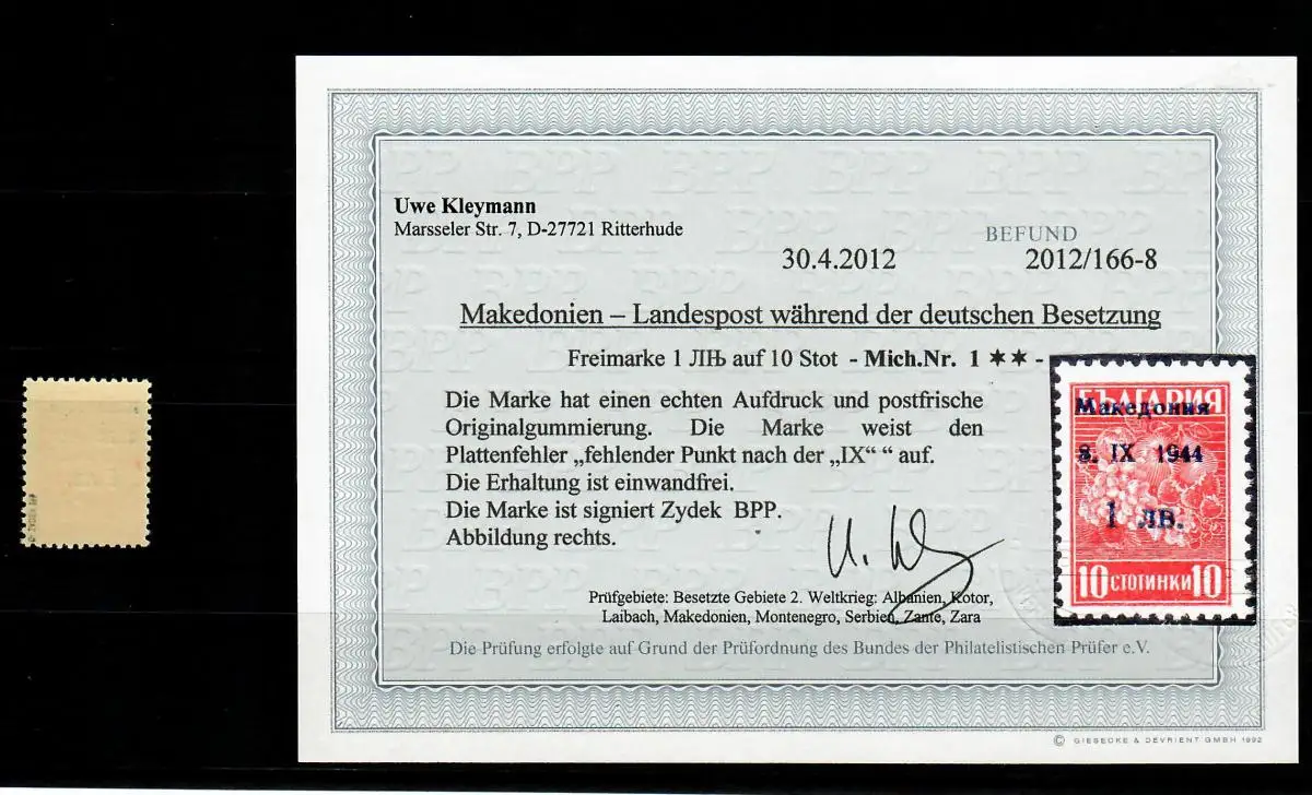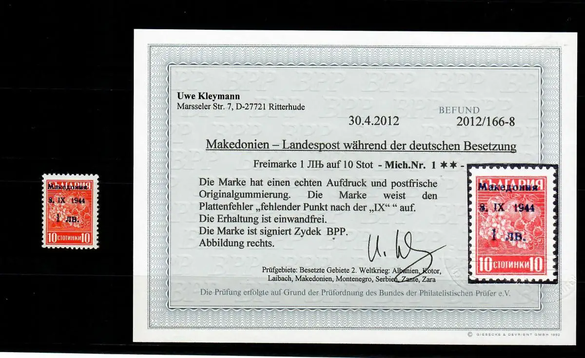 Makedonien MiNr. 1, Plattenfehler, postfrisch, **, BPP Befund