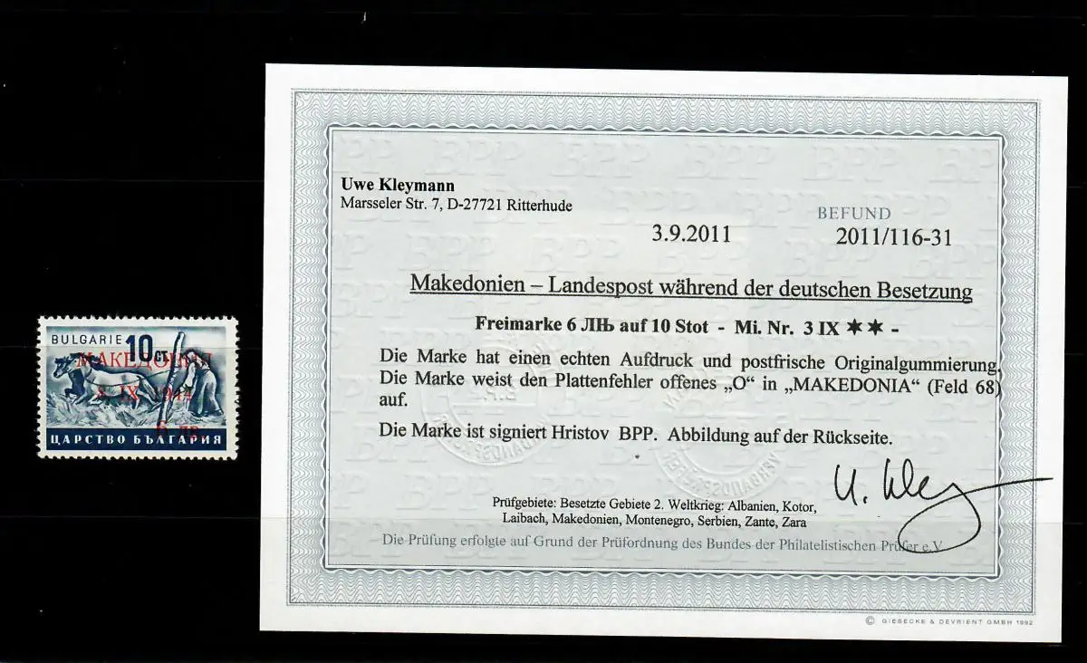 Makedonien MiNr. 3 IX Plattenfehler **, postfrisch, BPP Befund