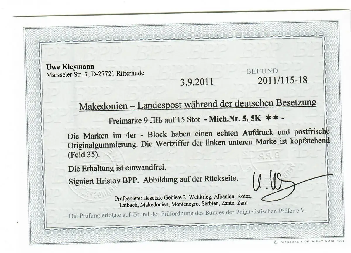 Makedonien MiNr. 5, 5K, kopfstehende Wertziffer, **, postfrisch, BPP Befund
