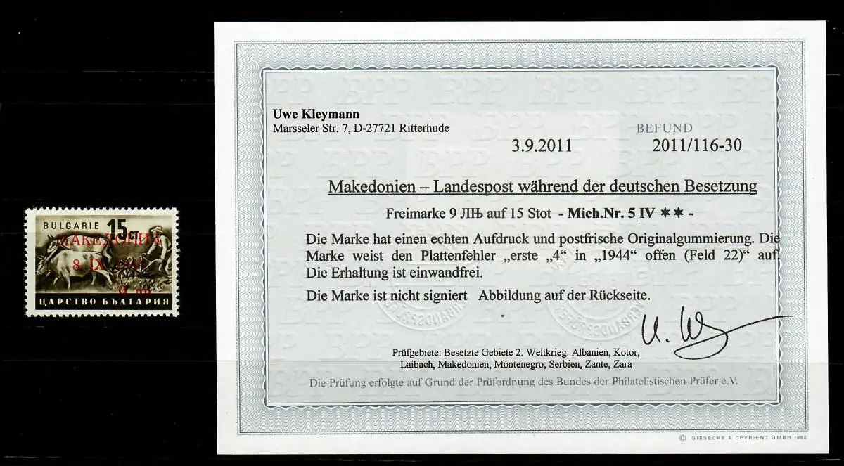 Makedonien MiNr. 5 IV, Plattenfehler, **, postfrisch, BPP Befund