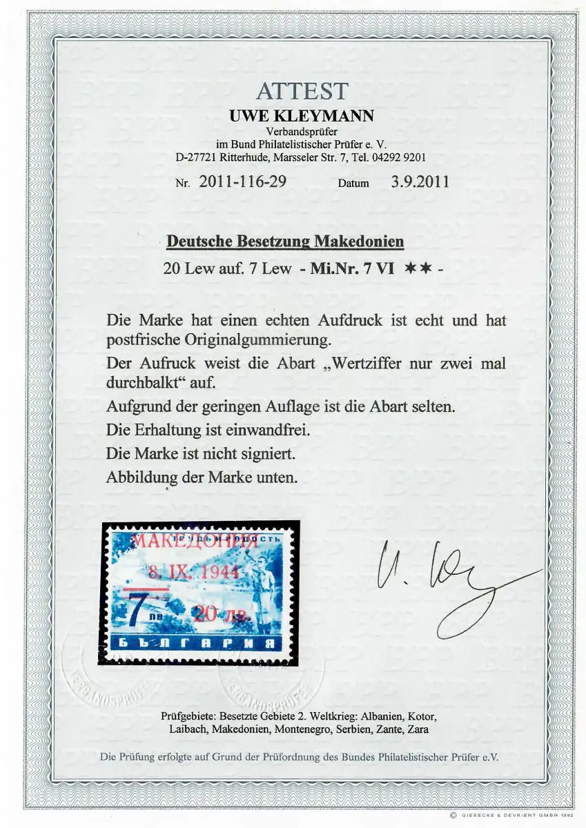 Makedonien MiNr. 7 VI, Abart, selten, postfrisch, **, BPP Attest