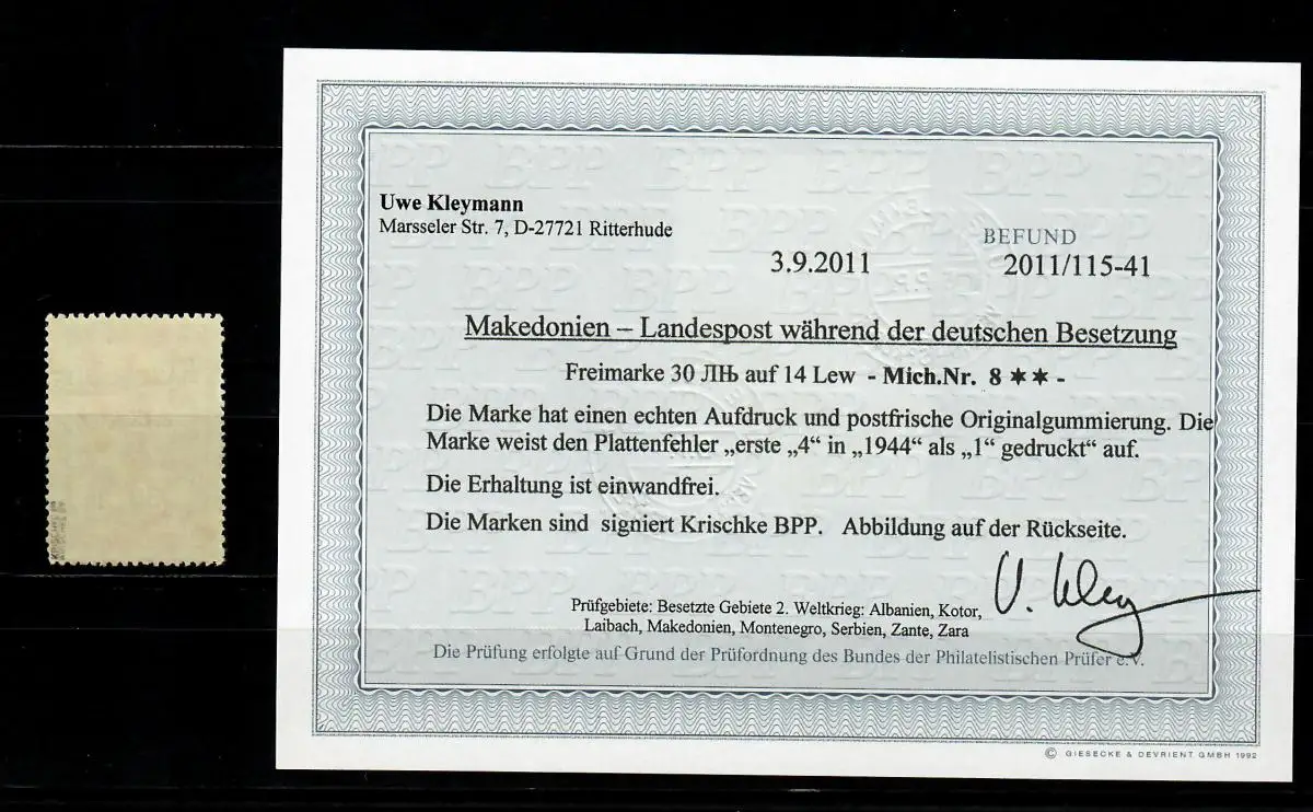 Makedonien MiNr. 8, Plattenfehler, postfrisch, **, BPP Befund