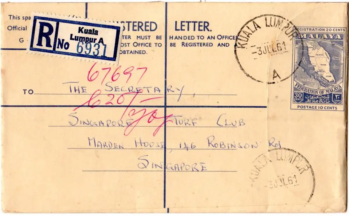 Malaya, 30 C. Einschreiben Ganzsache Brief v. Kuala Lumpur n. Singapore.