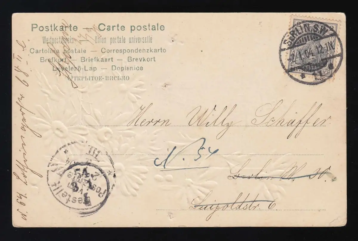 Margeriten auf weißem Grund, Glückwunsch zum neuen Jahre, Berlin S.W. 2.1.1904