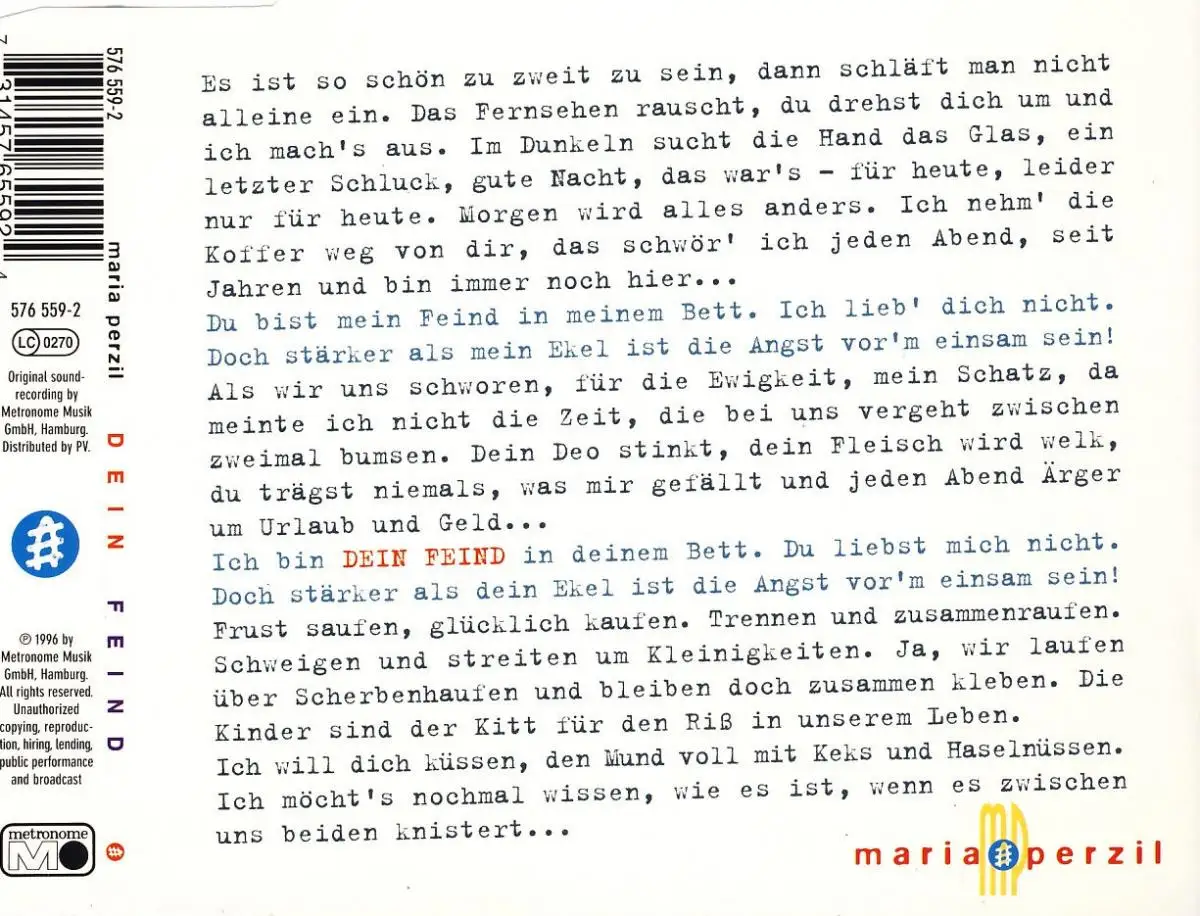 CD Single Maria Perzil - Dein Feind, incl. German Info-Sheet, Zustand CD VG+ Hülle M-; Made in Germany 1996 Metronome 576 559-2, Tracks 4:13, Bleib 3:55, Dernière Valse 3:42