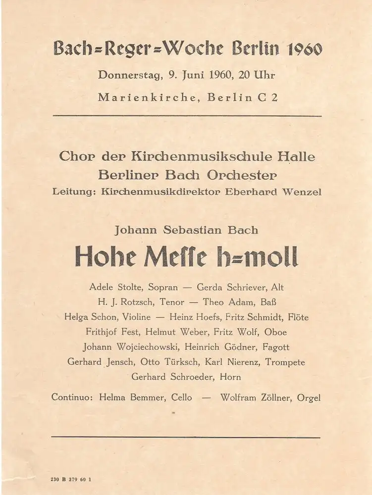 Bach-Reger-Woche Berlin. Chor der Kirchenmusikschule Halle und das Berliner Bach Orchester. Leitung: Eberhard Wenzel. Mitwirkende: Adele Stolte ( Sopran ), Gerda Schriever ( Alt ), H. J. Rotzsch ( Tenor ), Theo Adam ( Baß ), Helga Schon ( Violine), u. a. - Theaterprogramm, Opernprogramm, Ballettprogramm, Musicalprogramm, Konzertprogramm, Theatermemorabilia, Programmhefte Sammlung, deutsche Theatergeschichte.