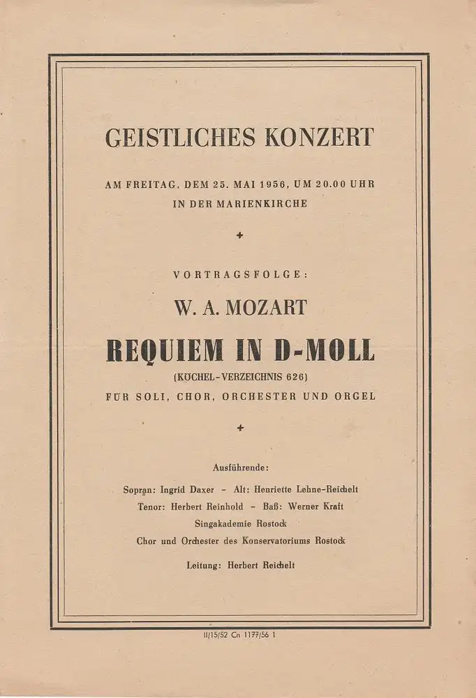 Koechel-Verzeichnis 626 für Soli, Chor, Orchester und Orgel. Mitwirkende: Ingrid Daxer, Henriette Lehne-Reichelt, Herbert Reinhold, Werner Kraft, Singakademie Rostock, Chor und Orchester des Konservatoriums Rostock. Leitung: Herbert Reichelt. - Schlüsselwörter: Theaterprogramm, Opernprogramm, Ballettprogramm, Musicalprogramm, Konzertprogramm, Theatermemorabilia, Programmhefte Sammlung, deutsche Theatergeschichte.