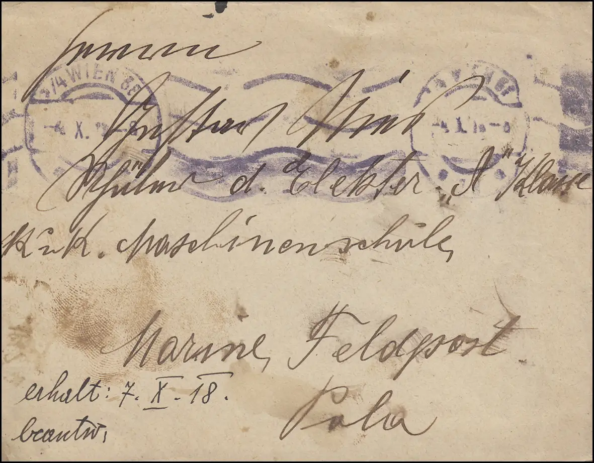 Marine-Feldpost Brief 9/4 WIEN 68 - 4.10.1918 an die K. und K. Maschinenschule