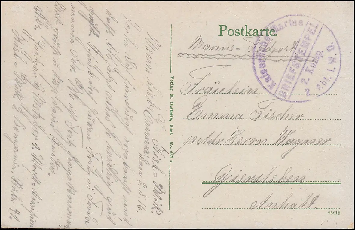 Marinefeldpost BS Kaiserliche Marine 2. Komp. 2. Abt. I.W.D. 2.8.16 auf AK Kiel