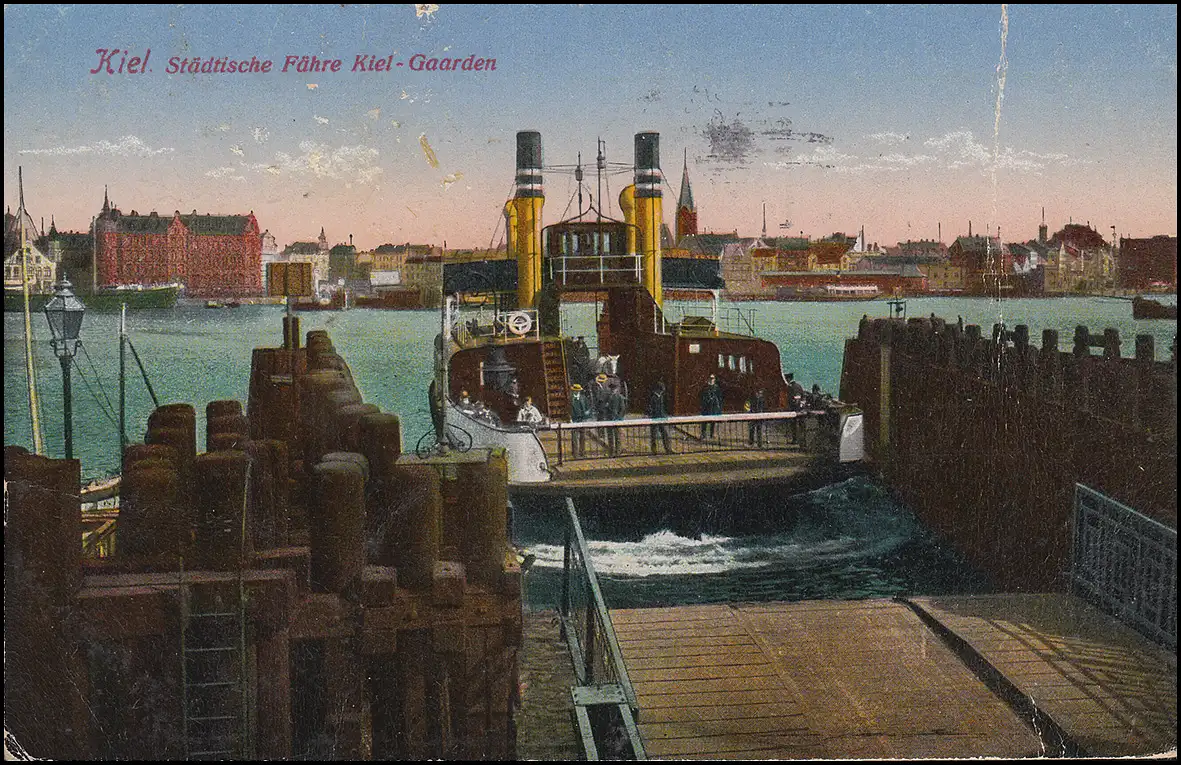 Ansichtskarte "Städtische Fähre Kiel-Gaarden", gelaufen nach Giersleben / Anhalt, bildseitg Knickspur
