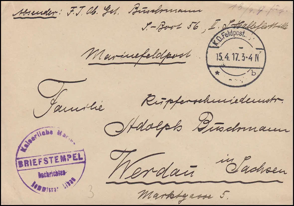 Marinefeldpost Nachrichten-Kommissar Libau apt. Stempel *b - 15.4.17 nach Werdau