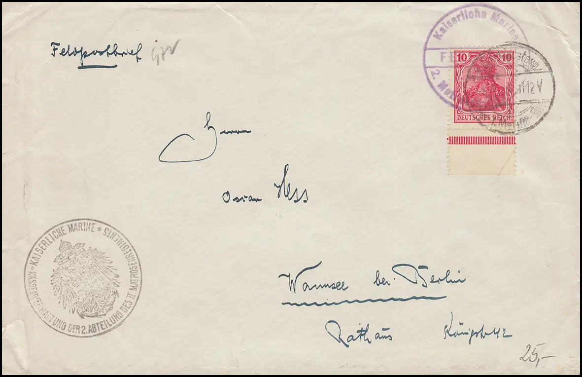 Frankierter Feldpostbrief mit Feldpoststempel "1. Marine-Division", mit Briefstempel "Kaiserliche Marine / Kommando 2. Matrosenregiment" sowie mit Nebestempel "Kaiserliche Marine Kassenverwaltung der 2. Abteilung des II. Matrosenregiments", nach Wannsse bei Berlin.