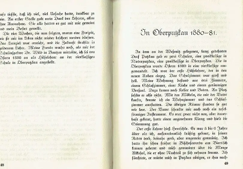sehr guter Zustand, geringe Gebrauchs- und Alterungsspuren: Rücken, Einbandecken und -kanten teils gering abgenutzt - Seiten überwiegend sauber und ordentlich - wohl nachgebunden oder privat überhaupt erstmalig gebunden (?), zur Datierung: auf Seite 64 ist das Jahr 1924 als das aktuellste erwähnt sächsische Privatdruck-Rarität "Ich bin am 31. Oktober 1860 in Frankenthal in der Lausitz geboren. Das Dorf Frankenthal liegt ungefähr 5 Kilometer westlich von Bischofswerda. Vierzehn Jahre hindurch habe ich das Landleben genossen, ein Glück, das ich um so höher schätze, je älter ich werde. Mein Vater war Kirchschullehrer in dem Orte. Ich war sein zweiter Sohn. Eine Tochter war vor meiner Geburt gestorben. Die Mutter hat uns Kindern oft eine Locke von ihrer innigst geliebten Margarethe gezeigt. Sie hatte sie dem toten Töchterlein abgeschnitten und bewahrte sie unter Glas und Rahmen auf. Ein reichliches Jahr nach meiner Geburt erhielt ich einen weiten Bruder ... In Bischofswerda 1881-83 Ostern 1881 versetzte mich der Schulrat Wild an die Bischofswerdaer Bürgerschule. Ich mußte meine schöne Landwohnung mit einer Mansarde auf dem Schulboden vertauschen, der Gehalt stieg nur um wenige Mark. Freilich gab es auch verschiedenes, was mich mit der Versetzung aussöhnte. So wurde gleichzeitig mit mir mein lieber guter Freund Reinhart Michel Hilfslehrer inBischofswerda. Mit offenen Armen wurde ich von den Familien Kneschke und Schneider aufgenommen, das Lehrerkollegium kannte ich von früher her schon, andere Bekannte gab es in Menge, auch Verwandte hatte ich in Bischofswerda. Die Bürgerschule bestand aus drei Abteilungen. Die erste Abteilung entsprach den früheren Dresdner Bürgerschulen und die zweite den Bezirksschulen. Die Selekta war eine höhere Volksschule. Ich hatte in allen drei Abteilungen zu arbeiten. Was das Benehmen der Kinder betraf, so sehnte ich mich bald nach meinen Dorfjungen und -mädchen zurück. Selbstverständlich zeichneten sichauch in Bischofswerda eine ganze Anzahl durch gutes Betragen aus. In der Selekta unterrichtete ich eine Helene Manitius, eine Tochter des ersten Amtsrichters. Sie ist später meine Frau geworden ... Am l5. April 1898 wurde uns eine Tochter geboren, wir nannten sie Dorothea. Am 30. Januar 1900 erhielt Dorothea ein Brüderchen. Es bekam den Namen Gerhard. Gerhard wurde bald schwerkrank, die künstliche Ernährung sagte ihm nicht zu. Sein Leben hing an einem Faden. Schließlich gaben wir ihm Eselsmilch, die half. Beide Kinder haben die IX. Bürgerschule aus der Silbermannstraße besucht, Dorothea bis zu ihrem 16., Gerhard bis zum 10. Lebensjahre. Dorothea hat sich später zur Chemotechnikerin ausgebildet. Gerhard hat die Dreikönigsschule durchgemacht und studiert jetzt auf der hiesigen Hochschule Elektrotechnik ... auch hebe ich noch besonders hervor, daß ich nach meinem Umzug nach Dresden-Trachau im neuen Wohnhaus in der Lehrersfamilie Baum Nachbarn gefunden habe, die an Liebenswürdigkeit, an natürlicher Herzensgüte nicht übertroffen werden können — aber das Traurige, Niederdrückende, Beschämende überwiegt derart — ein einziges Beispiel: die Absetzung des Oberschulrates Dr. Michel ... Mein Vater ist am 25. Dezember 1825 in Frankenthal bei Bischofswerda geboren. Sein Vater ist der Kirchschullehrer Samuel Hauffe gewesen, seine Mutter Henriette eine geborene Kletzsch aus Bischofswerda. Über die Jugend meines Vaters habe ich nicht viel erfahren. Meine Großmutter hat mir wiederholt erzählt, daß sie immer Freude an ihrem Sohne Reinhold gehabt habe. Seine Spielgenossen sind die Kinder des Barons von Friesen gewesen ...", Halbleinen, ca. 11,5 x 16,5, 86 Seiten