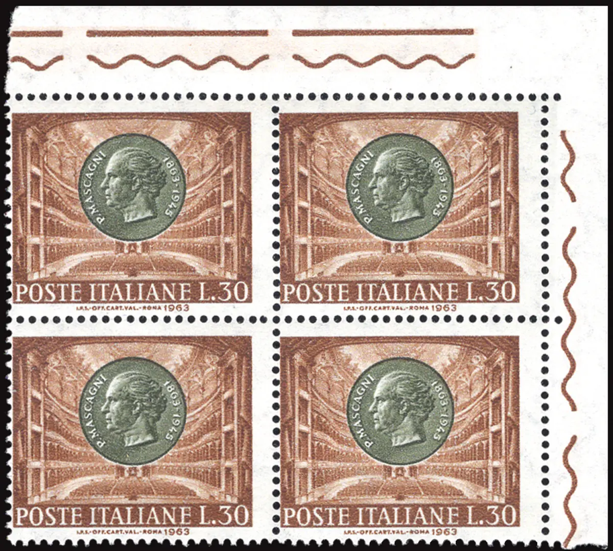 MNH - Vollgummi - - Mascagni Lire 30 Nr. 974 Viertel a. von f. mit leicht nach rechts verschobener vertikaler Verzahnung - Sorte sowieso offensichtlich, nicht katalogisiert Cod.669/182