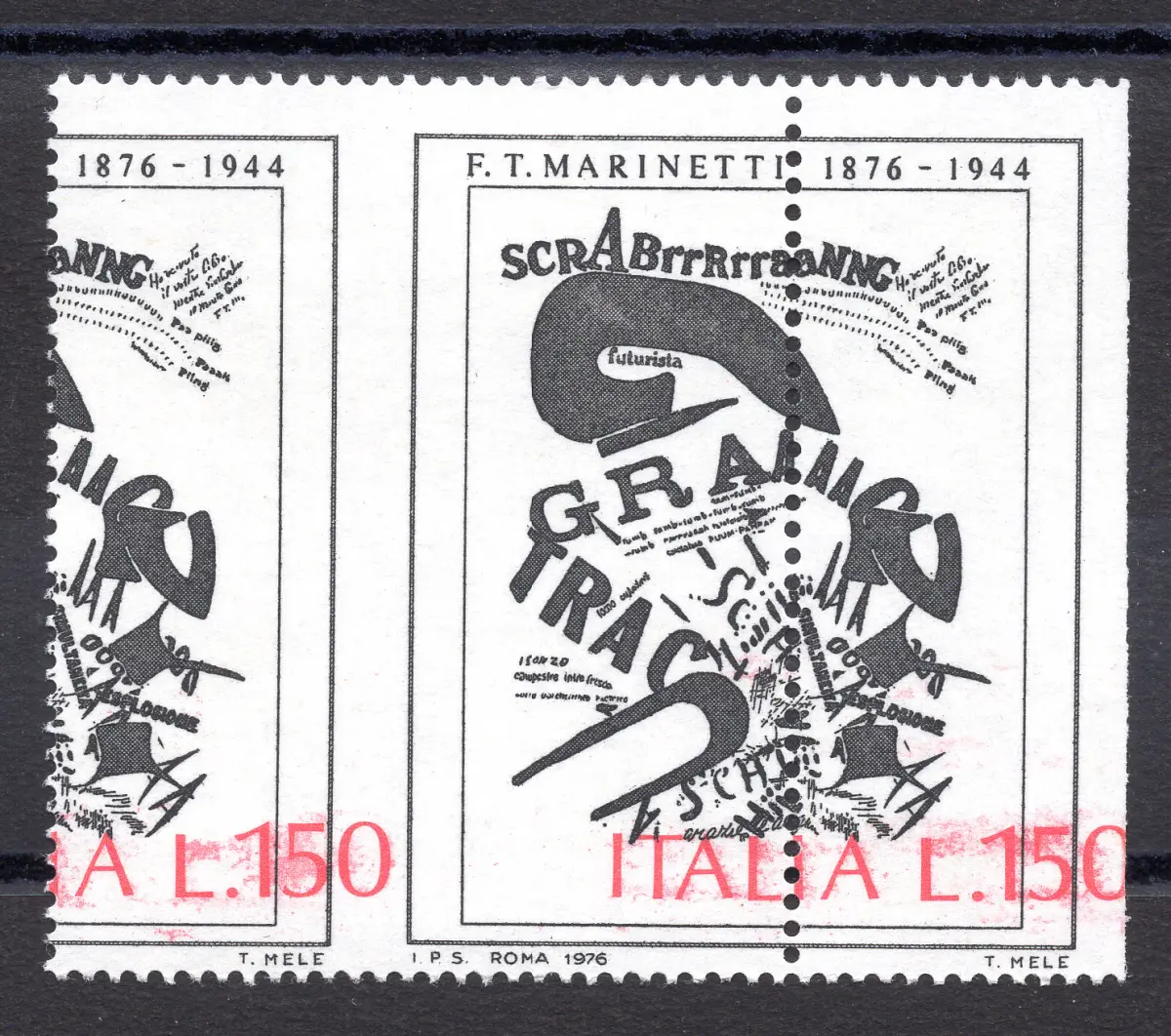 Marinetti Futurismus Sorte verschobene vertikale Verzahnung ** MNH - Marinetti 1976 Sorte verschobene vertikale Verzahnung und roter Druck nach rechts verschoben - Uncommon Cod. 328/WEB