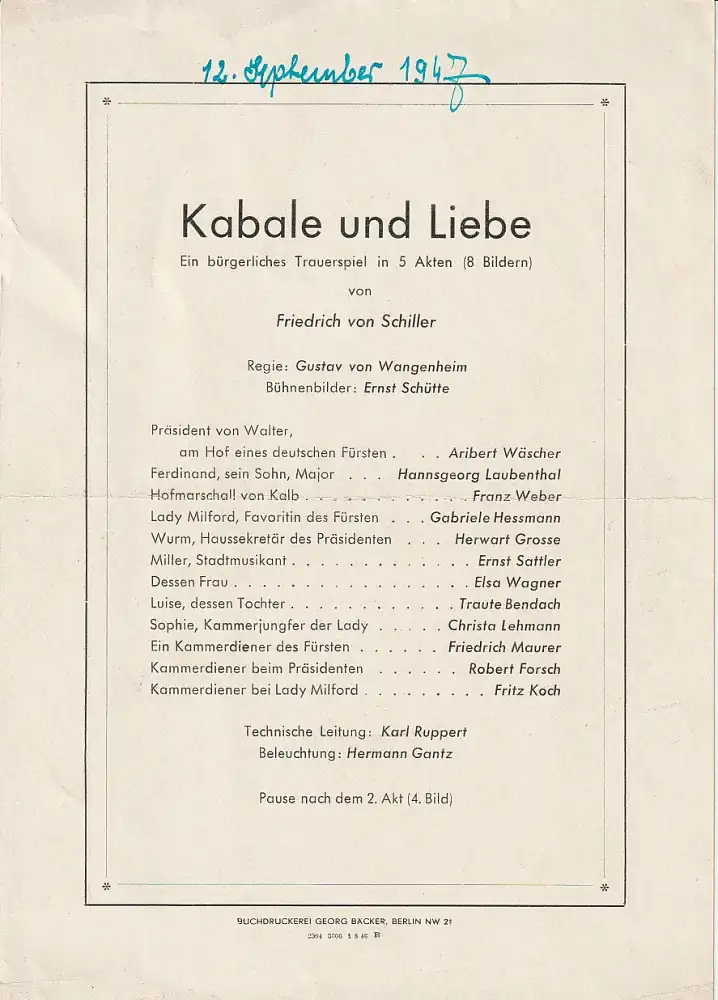 Max Reinhardts Deutsches Theater: Theaterzettel Friedrich von Schiller KABALE UND LIEBE 1947.