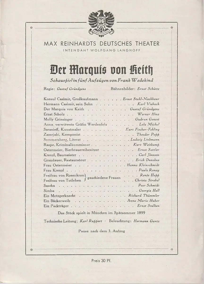 Max Reinhardts Deutsches Theater, Wolfgang Langhoff: Programmheft Frank Wedekind DER MARQUIS VON KEITH.