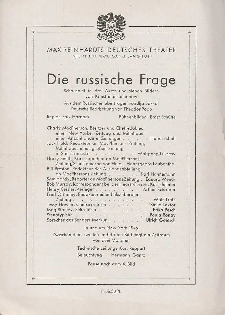 Max Reinhardts Deutsches Theater, Wolfgang Langhoff: Programmheft Konstantin Simonow DIE RUSSISCHE FRAGE.