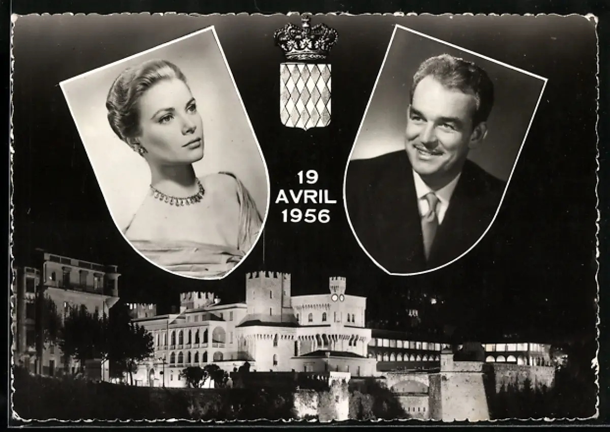 Maximum-AK Portrait Fürst Rainier von Monaco & Grace Kelly, Fürstenpalast mit Wappen