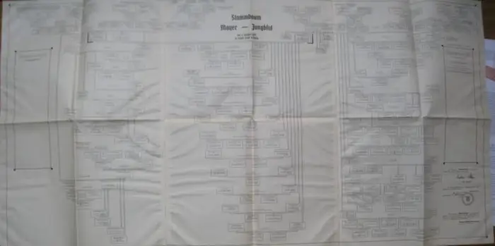 Das Dokument trägt den gedruckten Vermerk : Der Stammbaum Mayer - Jungblut wurde gesetzt und gedruckt in der Zeit vom Oktober 1934 bis Februar 1937. --- Aus dem aufgelösten, genealogischem Archiv der Arbeitsgemeinschaft für Familiengeschichte im Kulturkreis Siemens mit deren Signatur und Stempel nur auf der Rückseite des Stammbaums.