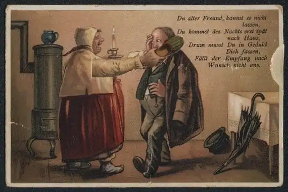 Mechanische-AK Heimkehrer von der Leipziger Messe bekommt von seiner Frau eins Übergezogen, frauenfeindlicher Humor