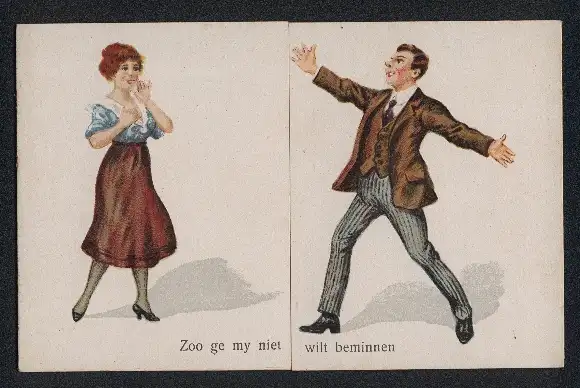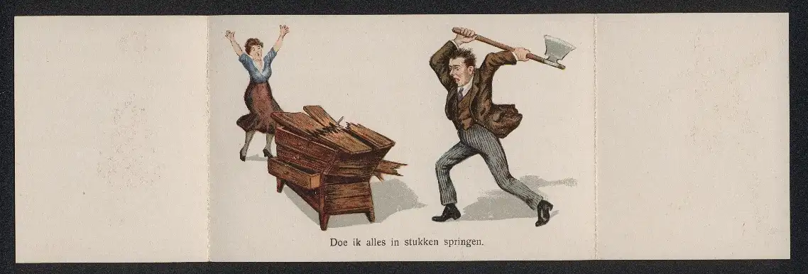 Mechanische-AK Mann tanzt fröhlich auf eine Dame zu, zerschlägt die Kommode