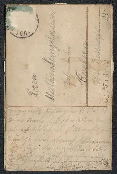 alte Ansichtskarte, gelaufen, Briefmarke entfernt, Vorder- und Rückseite großflächig voneinander gelöst
