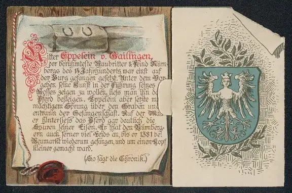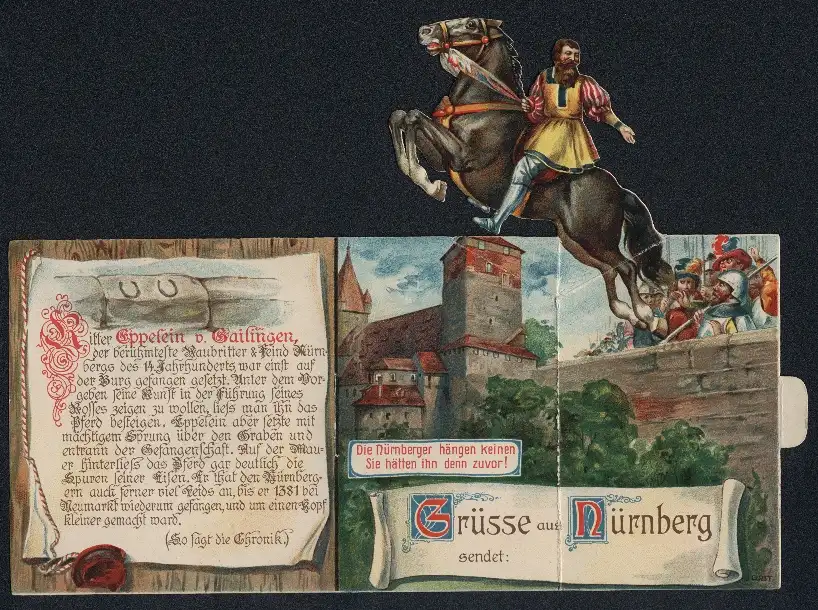Mechanische-Künstler-AK Nürnberg, Ritter Eppelein v. Gailingen auf seinem Pferd, Spruch