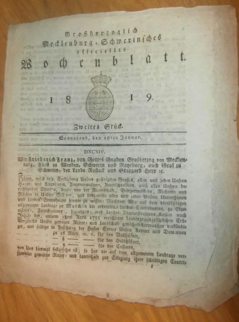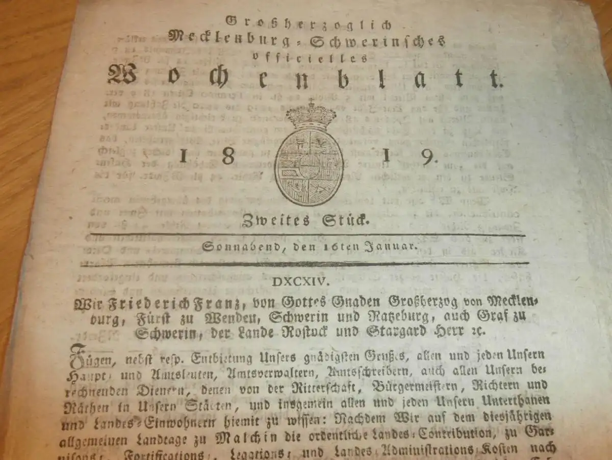 Großherzogliches Mecklenburg-Schwerinsches Wochenblatt 1818:Hier einige Stichworte um die es geht: Mecklenburg - Schwerin 16.01.1819 , Hüfner in Mecklenburg , Löhne und Gehälter der Berufe !!AZB-1/WR2