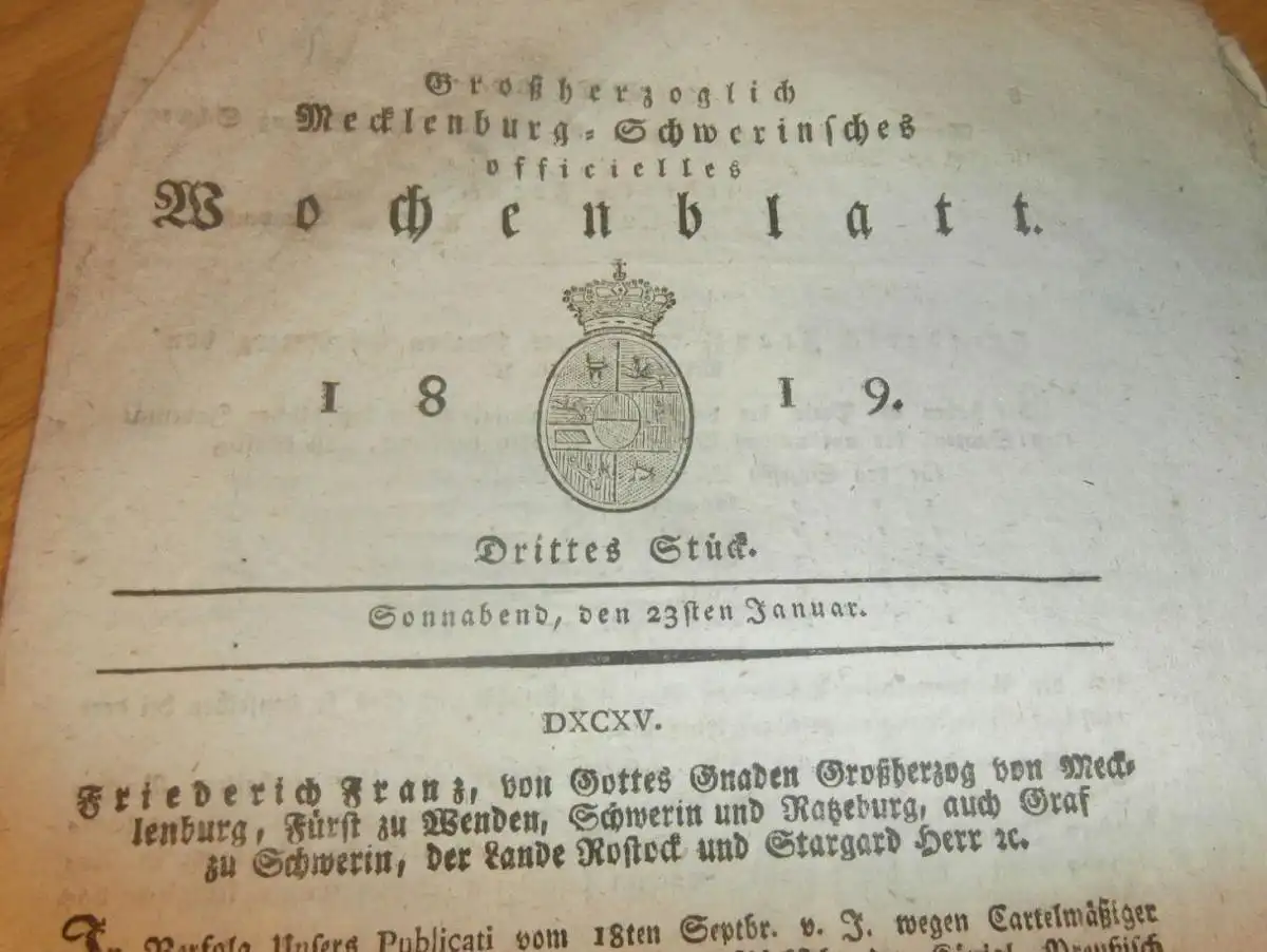 Großherzogliches Mecklenburg-Schwerinsches Wochenblatt 1818:Hier einige Stichworte um die es geht: Mecklenburg - Schwerin 23.01.1819 , Preise für Getreide , Lehneid Gut Tarnow , Güstrow Gut Lübsee , J.A. Wachenhusen !!AZB-1/WR2