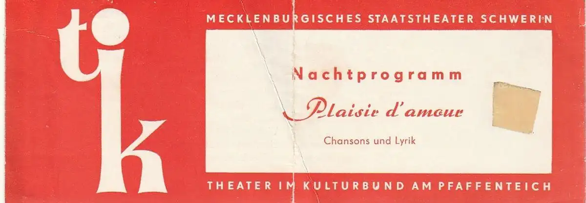 Mecklenburgische Staatstheater Schwerin, Rudi Kostka: Programmheft NACHTPROGRAMM PLAISIR D'AMOUR CHANSONS UND LYRIK TIK Theater im Kulturbund am Pfaffenteich Spielzeit 1970 / 71 Heft 4.