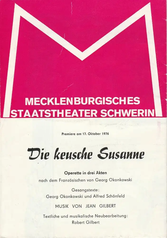 Mecklenburgisches Staatstheater Schwerin, Fritz Wendrich, Veronika Preiß, Volkmar Förster: Programmheft Jean Gilbert DIE KEUSCHE SUSANNE Premiere 17. Oktober 1976 Spielzeit 1976 / 77 Heft 6.