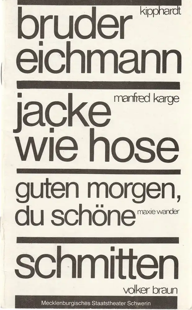 Mecklenburgisches Staatstheater Schwerin, Ingrid Wille, Bärbel Jaksch, Gisela Kahl, Rainer Jahnke, Uwe Sinnecker: Programmheft Bruder Eichmann / Jacke wie Hose / Guten Morgen du Schöne / Schmitten.