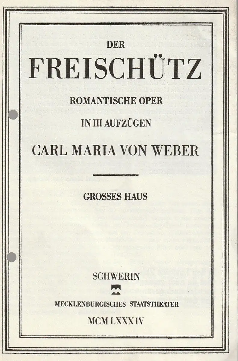 Mecklenburgisches Staatstheater Schwerin, Liane Pfelling, Elisabeth Nebel, Uwe Sinnecker: Programmheft Carl Maria von Weber DER FREISCHÜTZ Premiere 26. Februar 1984 Großes Haus Spielzeit 1983 / 84.