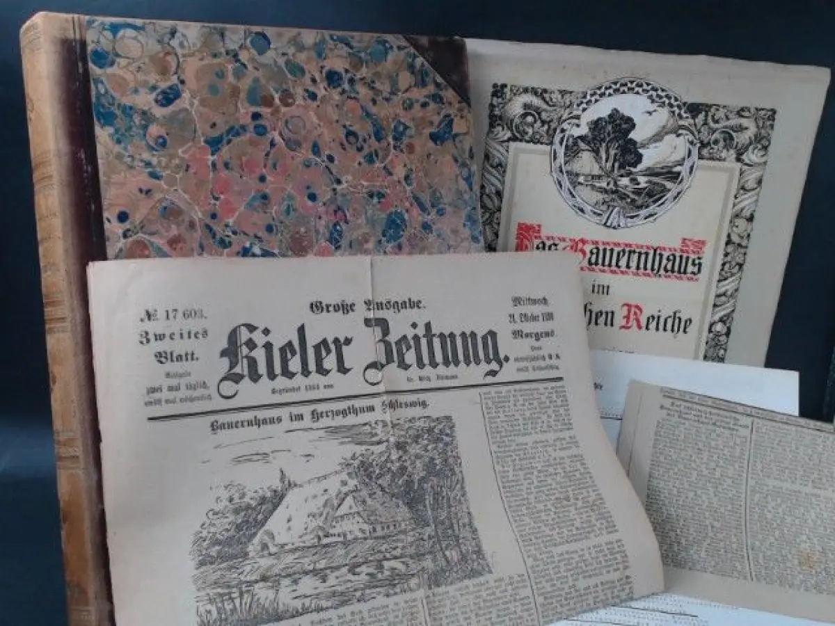 Das Bauernhaus im Herzogtum Schleswig und das Leben des schleswigschen Bauernstandes im 16. 17. und 18. Jahrhundert von R. Meiborg. Deutsche Ausgabe besorgt von Richard Haupt. Exlibris. Private Widmung. Einband leicht lichtrandig mit leichten Kantenbestößen. Buchrücken aufgehellt. Papier leicht gebräunt und teils leicht fleckig. Sonst guter Gesamtzustand. Als Beigabe: Werbung für das Buch "Das Bauernhaus im Deutschen Reiche und in seinen Grenzgebieten", Kopien zur Tagung der Gesellschaft für Vor- und Frühgeschichte 1976, 1 Zeitungsartikel zum Thema und 1 Doppelblatt der "Kieler Zeitung" vom 21. Oktober 1896 zum Thema