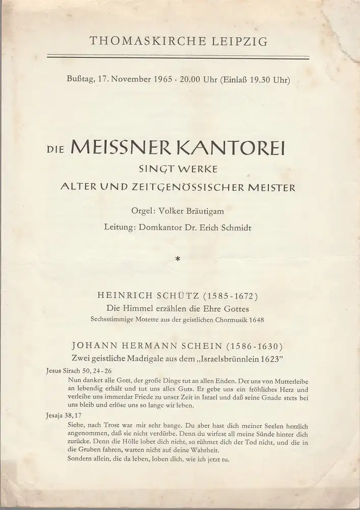 Meissner Kantorei: Programmheft DIE MEISSNER KANTOREI SINGT WERKE ZEITGENÖSSISCHER MEISTER 17. November 1965 Thomaskirche Leipzig.